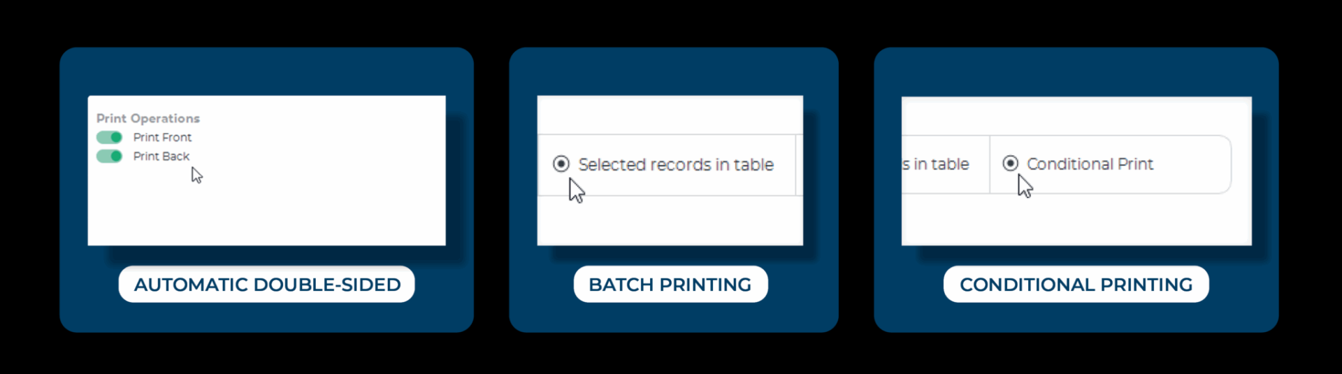 In hàng loạt: rất thiết thực để sản xuất số lượng lớn thẻ chỉ với một cú nhấp chuột. Chỉ cần kết nối cơ sở dữ liệu và bắt đầu in, sau đó phần mềm tự động quản lý mọi thứ.