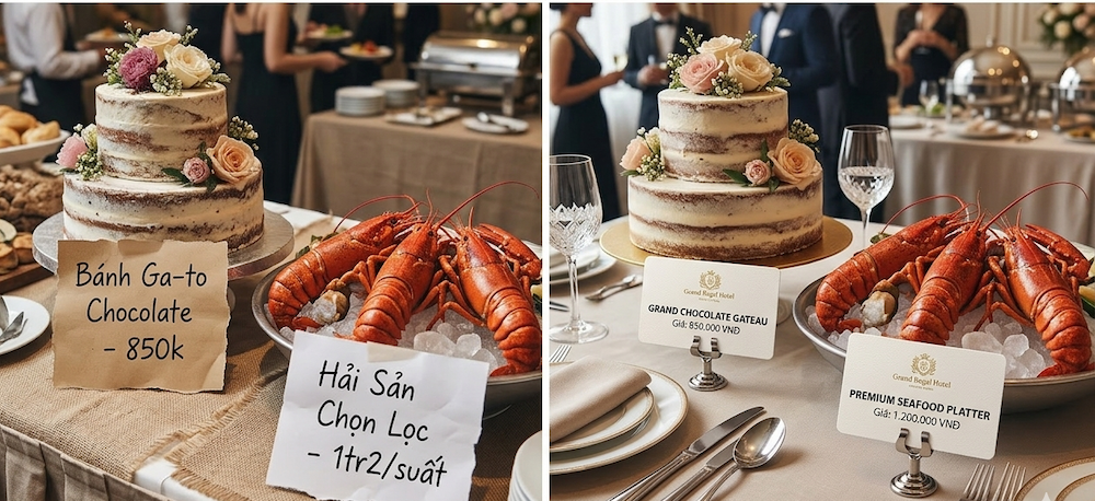 Hãy hình dung: Trong một khách sạn tên tuổi, đẳng cấp, một bàn tiệc buffet được bày biện đẹp mắt với những món ăn tinh tế, nhưng tấm thẻ tên món ăn lại là một mẩu giấy được cắt xén qua loa, chữ viết tay nguệch ngoạc hoặc bị ố lem vì sốt. Sự tương phản này sẽ ngay lập tức làm giảm giá trị cảm nhận của toàn bộ bữa tiệc, hơn nữa nhiều người sẽ đánh giá yếu tố kém chuyên nghiệp trong việc trải ngiệm ẩm thực bị ngắt quãng bởi những chi tiết tưởng chừng không quan trọng này.